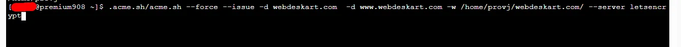 ~/.acme.sh/acme.sh –issue -d yourdomain.com -d www.yourdomain.com -w /home/username/public_html/ –server letsencrypt